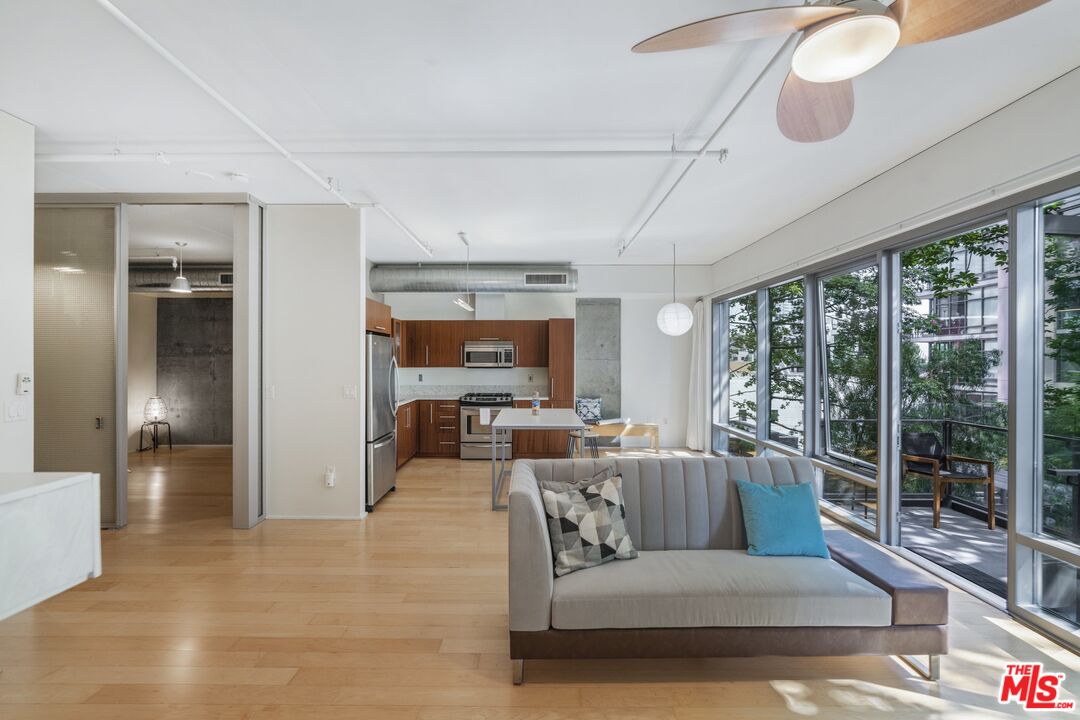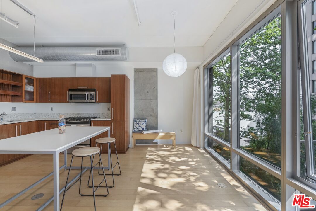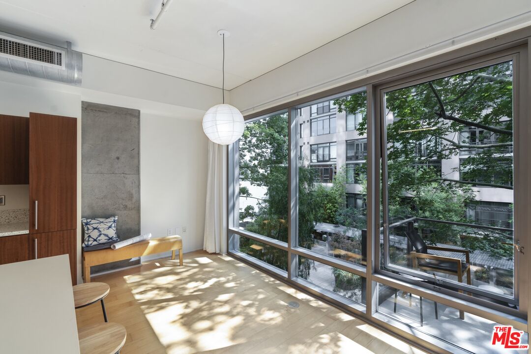 Bright and Quiet Soft Loft facing the Courtyard with pool in the heart of South Park at Luma. Hardwood floors, high ceilings, floor-to-ceiling, wall-to-wall windows, and a rare balcony surrounded by trees giving privacy and shade. Wake up to hummingbirds outside your window. Recently upgraded with modern room dividers and a bonus area that can double as an office or extra bedroom when you have guests featuring a built-in murphy bed. Prime parking space is less than twenty strides to the elevator. The unit is unique with a deep hallway closet as well as a walk-in closet in the bedroom and only one adjacent neighbor. Luma was built in 2007 and is LEED-certified (green building) and features 24/7 doorman, pool, gym, and barbecue area. Located in South Park and close to LA Live, Staples Center, Whole Foods, Metro Train Station, Starbucks, and many eateries and entertainment.
