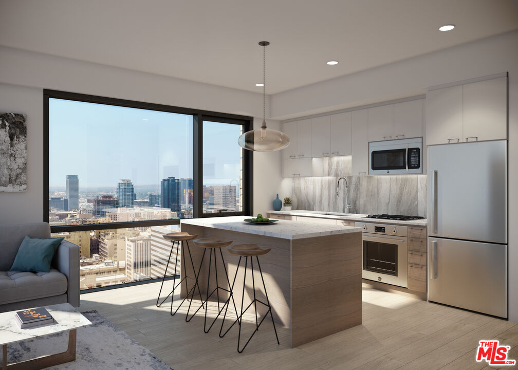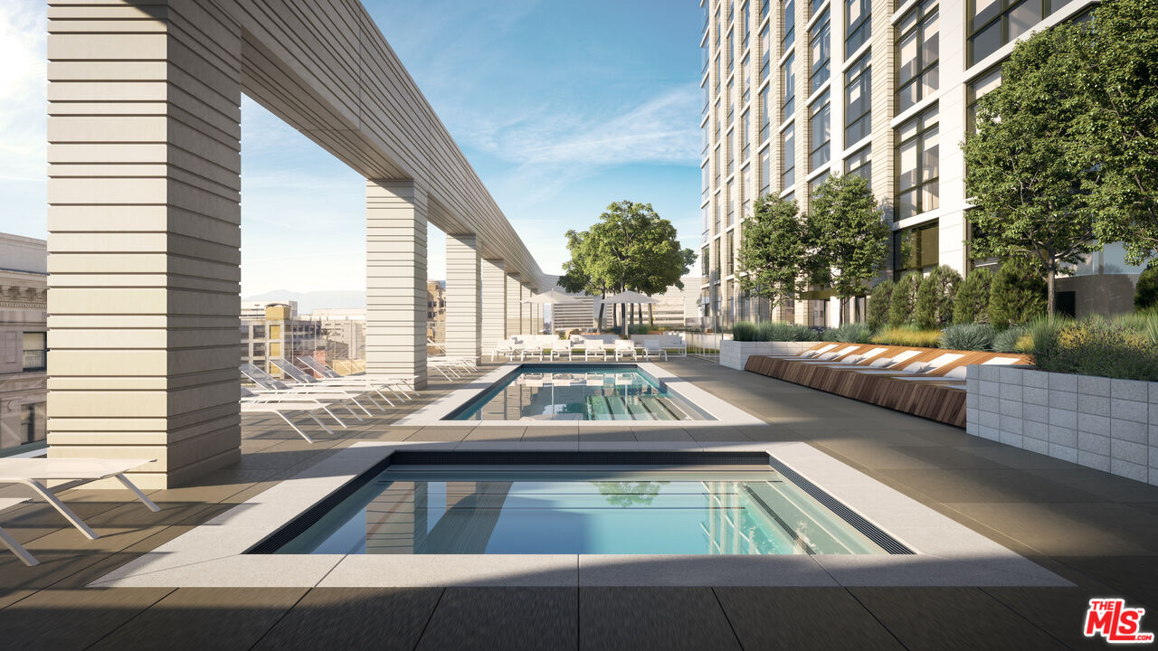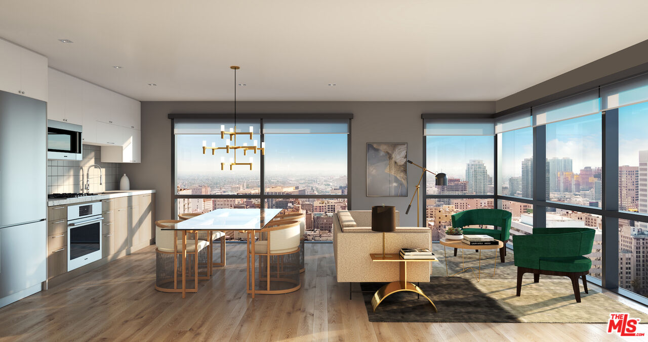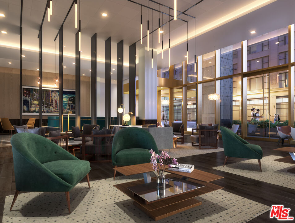 Classic LA Glamour Meets Contemporary Sophistication and Design Welcome to this stunning 2-bedroom, 2-bathroom home at Perla, a brand new luxury condominium offering residents a prime Broadway address and a collection of lavish lifestyle amenities tailored to modern Los Angeles living. This luminous corner apartment is an exemplar of contemporary urban design, with warm organic tones providing a fresh palette for any style. Floor-to-ceiling windows frame incredible views of San Gabriel, Hollywood Hills, or the Downtown LA skyline. Natural light spills onto European white oak floors, and a Bosch washer/dryer, fiber optic pre-wiring, and energy-efficient LED lighting are thoughtful finishing touches. Past a tasteful entry gallery with a coat closet and plenty of wall space for hanging art, the home flows into an open-concept living room, dining room, and kitchen saturated with natural light. The kitchen is equipped with polished quartz countertops, a porcelain tile backsplash, and a suite of high-end fully integrated stainless steel appliances from Bertazzoni. Both bedrooms are quiet and private thanks to a thoughtful split-wing layout. The primary bedroom has a large reach-in closet and a full en-suite bathroom bathroom adorned with designer-selected tile, contemporary wood cabinetry, and illuminated mirrored medicine cabinet, polished chrome fixtures from Kohler, and a deep soaking tub. The second bedroom has private closet space and sits across from a second full bathroom with similar finishes. Nestled in the heart of the Historic Core, Perla rises 35 stories and blends urban chic with Art Deco charm. Perla's incredible amenities offering spans 44,000 sq. ft. and unfurls around an airy four-story atrium graced with multiple seating areas and suffused with natural light. Residents can relax or entertain in a gaming lounge, wine tasting room, private theater, library lounge, or Clubroom with a full kitchen and adjacent dining space. Work-from-home options are plentiful with several meeting areas and workspaces. A trio of landscaped terraces offer communal grilling stations, fireplace lounge seating, an outdoor pool, and chaise seating. Fitness enthusiasts will enjoy a fully equipped gym, a yoga studio, and a rooftop yoga and stretching deck. Pet owners are sure to make use of the pet spa and dog park. The building is surrounded by city landmarks, cultural institutions, and dozens of trendy dining and shopping options. Grand Central Market and the acclaimed Bradbury Building are just down the street, while The Museum of Contemporary Art, Regent Theater, Walt Disney Concert Hall, Pershing Square, and Grand Park are all close by. An accessible LA Metro line makes getting around the rest of the city quick and convenient.