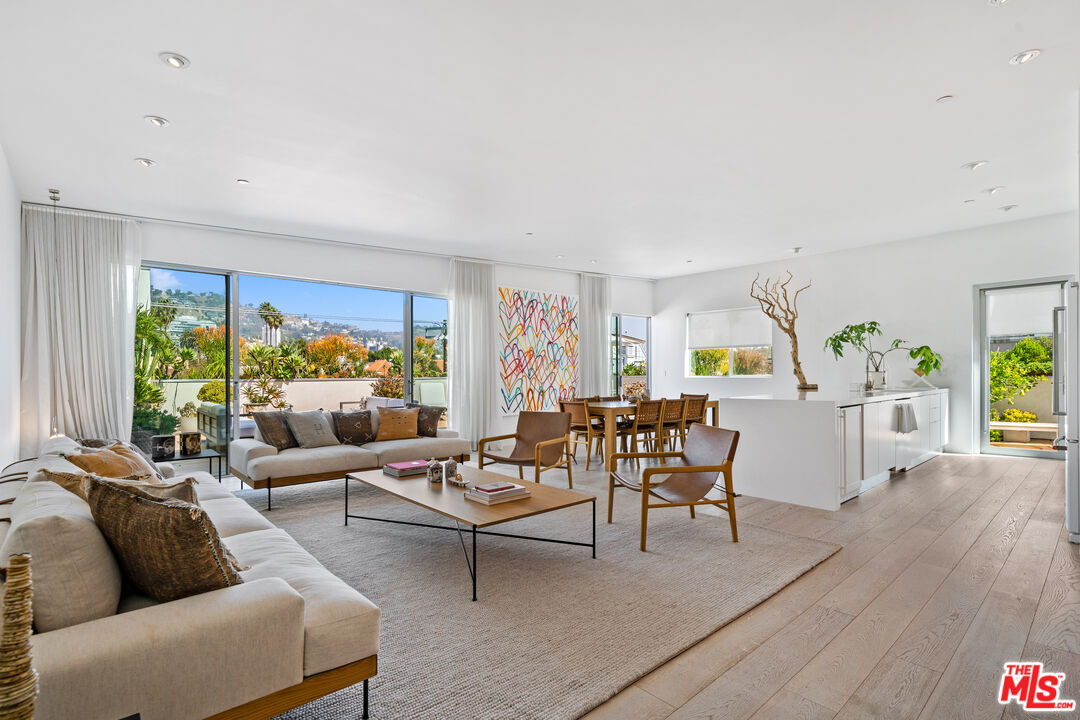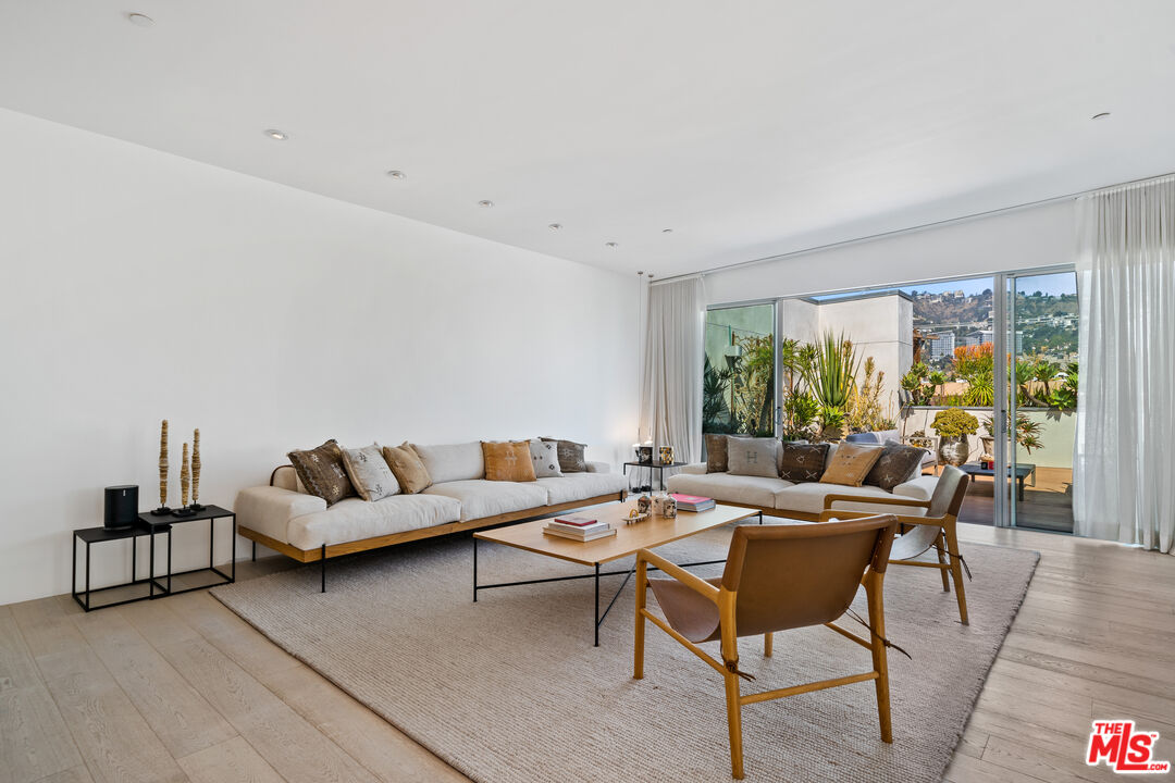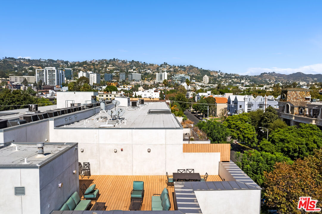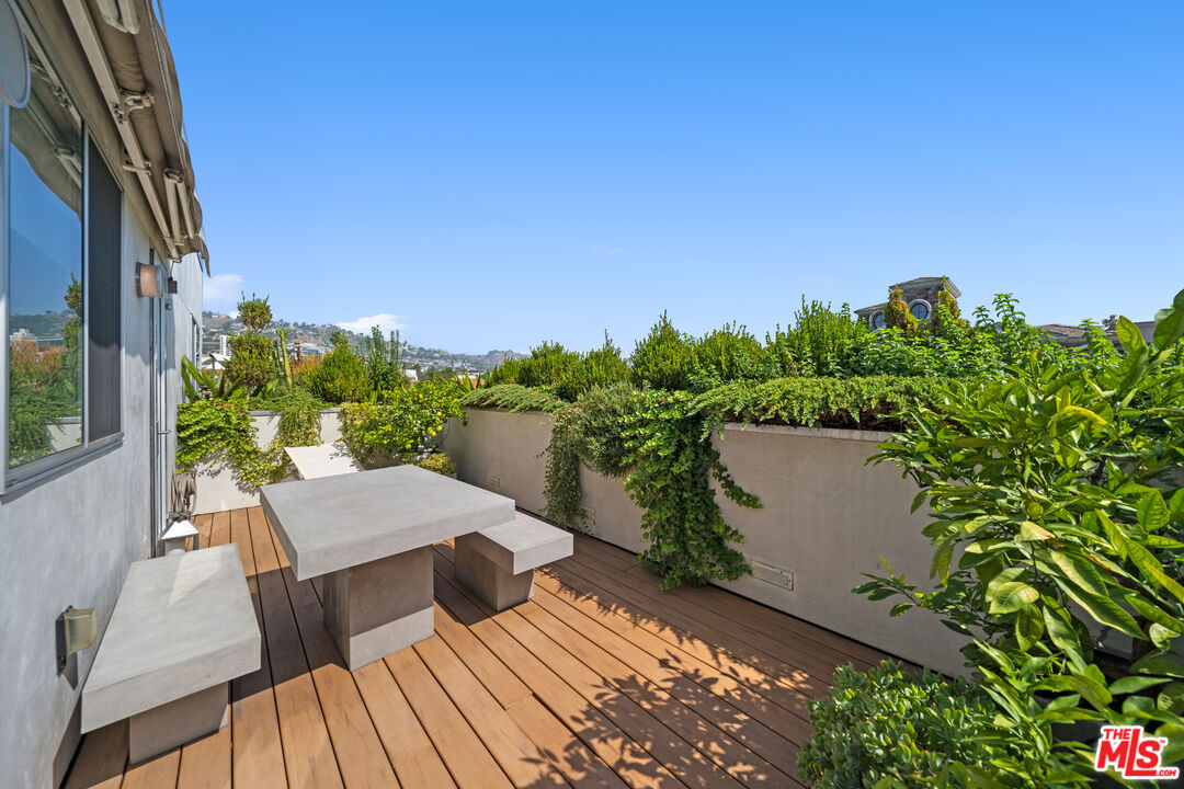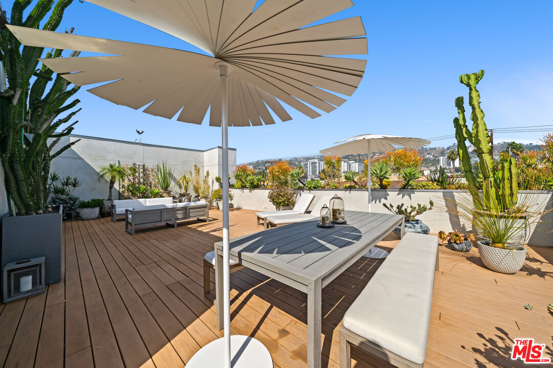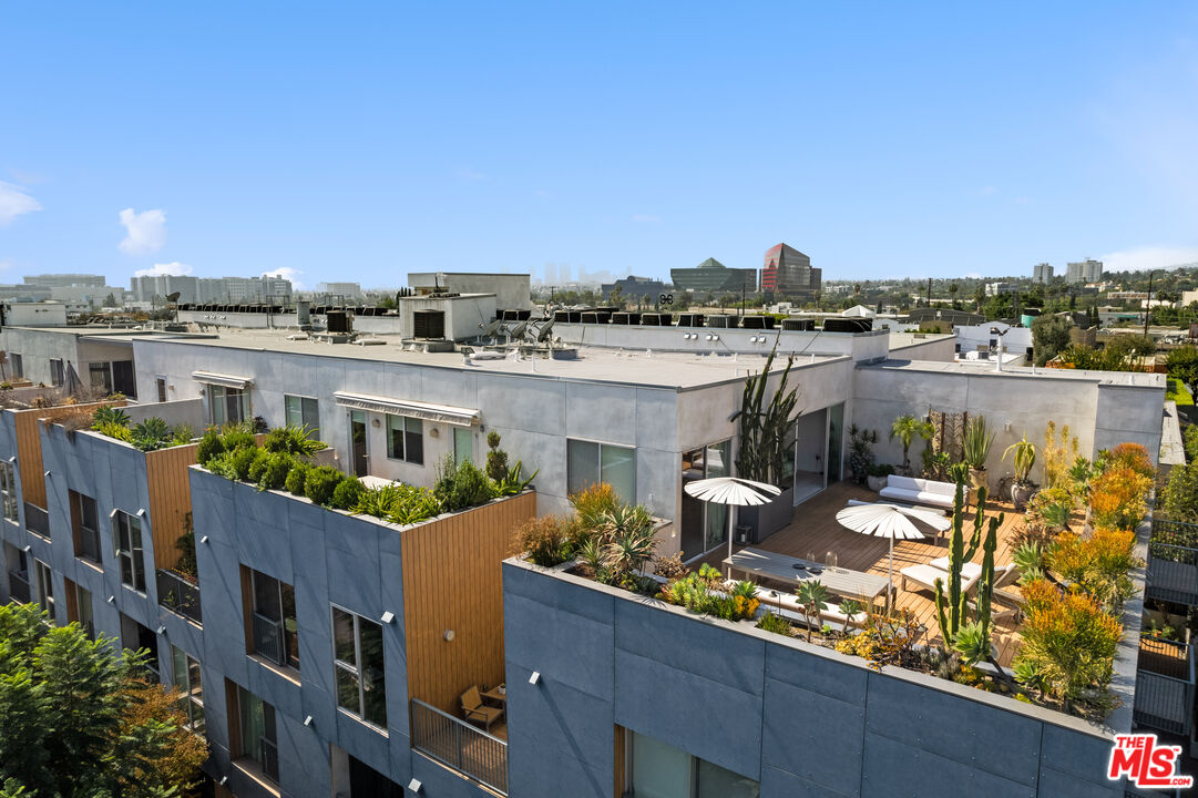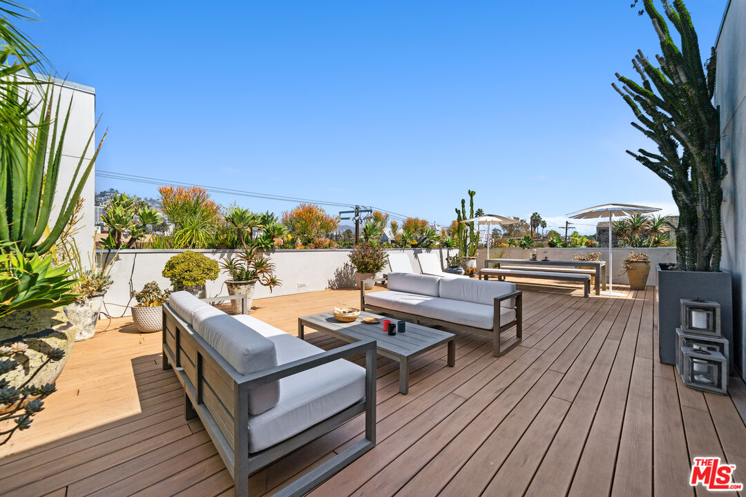 In a class by itself, this stunning single level designer penthouse has outdoor oasis living spaces in excess of 1200 square feet (Independently measured). Situated in a beautiful modern environment designed by Zoltan Pali for SPF: architects, it has all the convenience of lock-up and go living in the ultimate location in the Melrose district. This chic unit with high ceilings, huge walls for art, incredible finishes, abundant light and postcard views of the Hollywood Hills will excite you every time you see it. The open floor plan with jaw dropping immense deck flows seamlessly off the living room. There are two spacious primary suites each with beautiful patios. Unit comes with side-by-side parking, extra garage storage and in unit laundry room. Highly sought-after location just a short stroll to Melrose Place. Why buy a house when you can have all this outdoor space, no common walls and minimal upkeep. All furniture and furnishings are available for sale.
