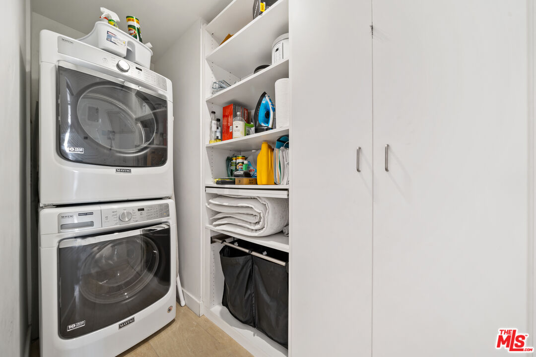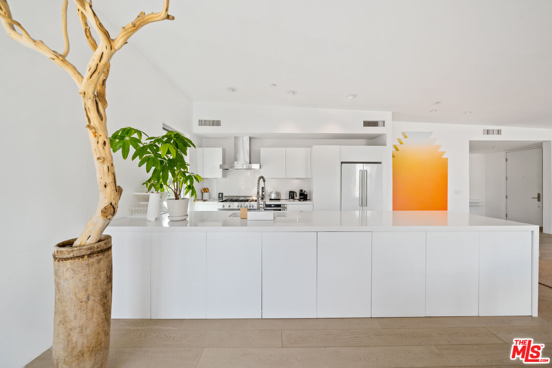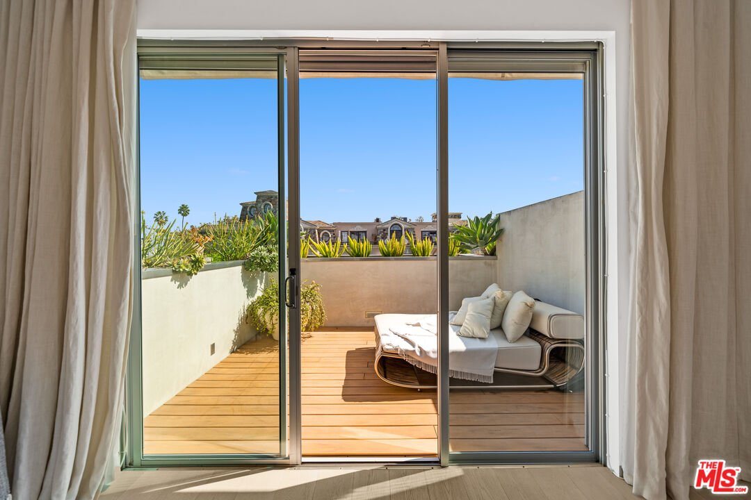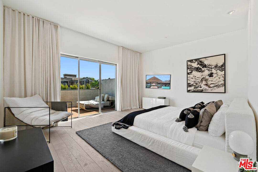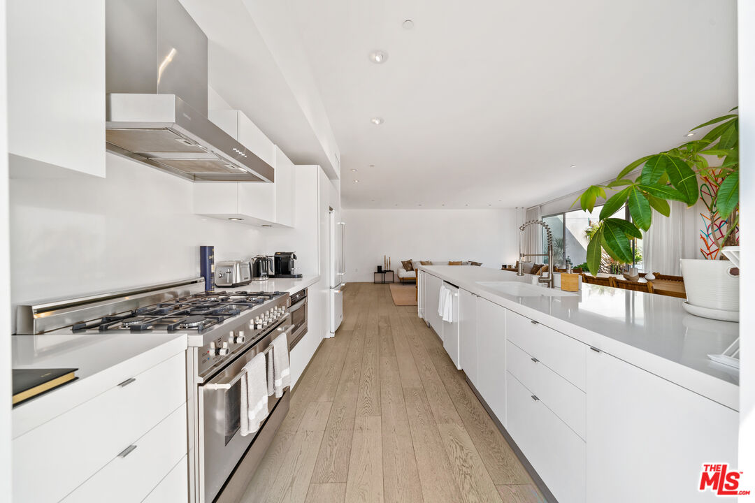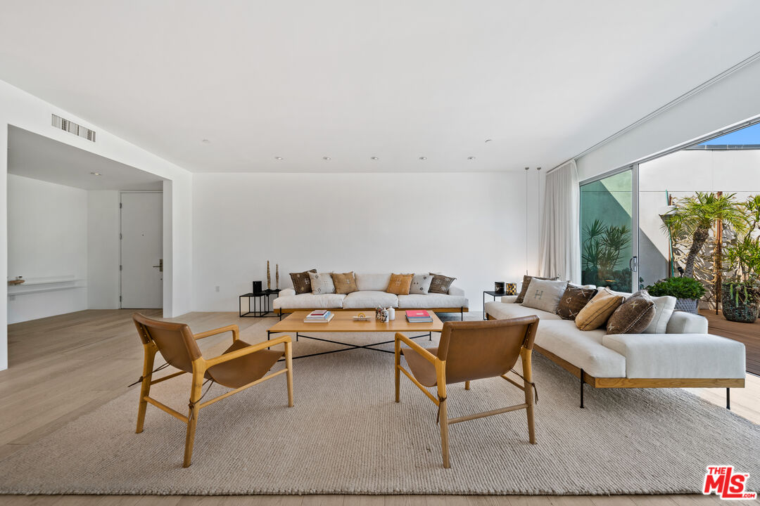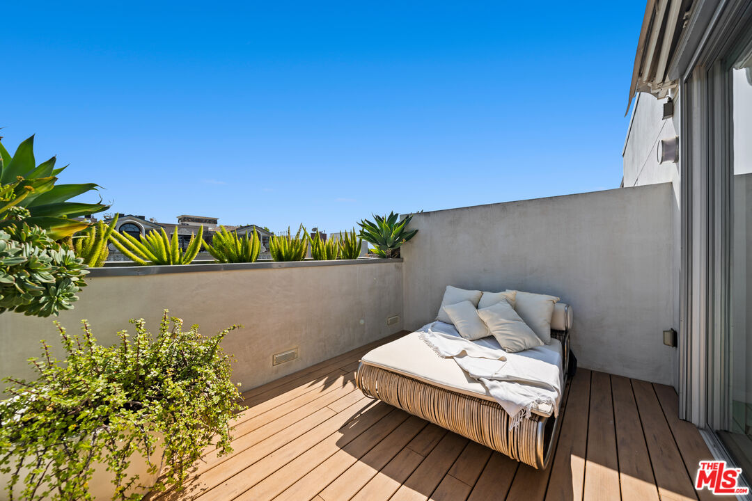 In a class by itself, this stunning single level designer penthouse has outdoor oasis living spaces in excess of 1200 square feet (Independently measured). Situated in a beautiful modern environment designed by Zoltan Pali for SPF: architects, it has all the convenience of lock-up and go living in the ultimate location in the Melrose district. This chic unit with high ceilings, huge walls for art, incredible finishes, abundant light and postcard views of the Hollywood Hills will excite you every time you see it. The open floor plan with jaw dropping immense deck flows seamlessly off the living room. There are two spacious primary suites each with beautiful patios. Unit comes with side-by-side parking, extra garage storage and in unit laundry room. Highly sought-after location just a short stroll to Melrose Place. Why buy a house when you can have all this outdoor space, no common walls and minimal upkeep. All furniture and furnishings are available for sale.