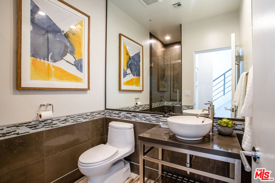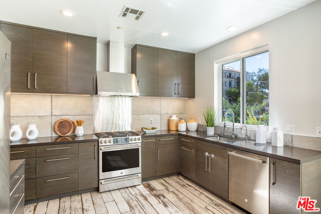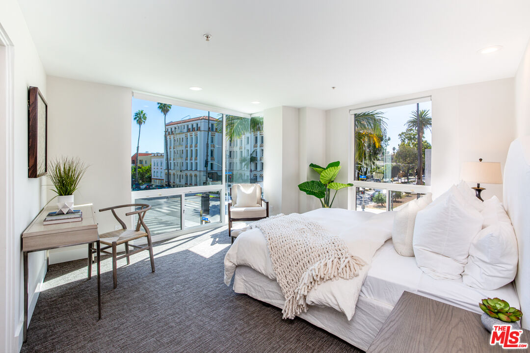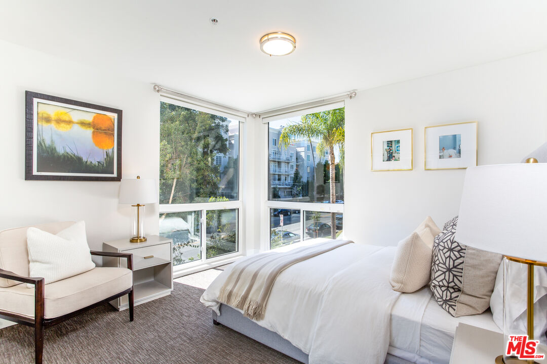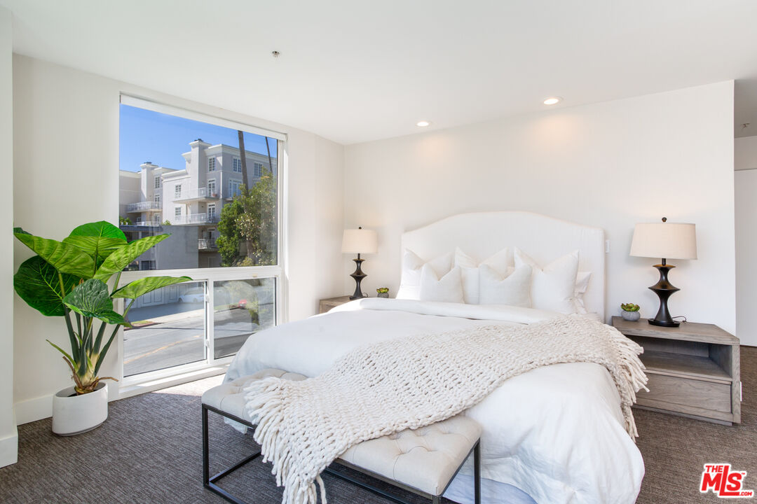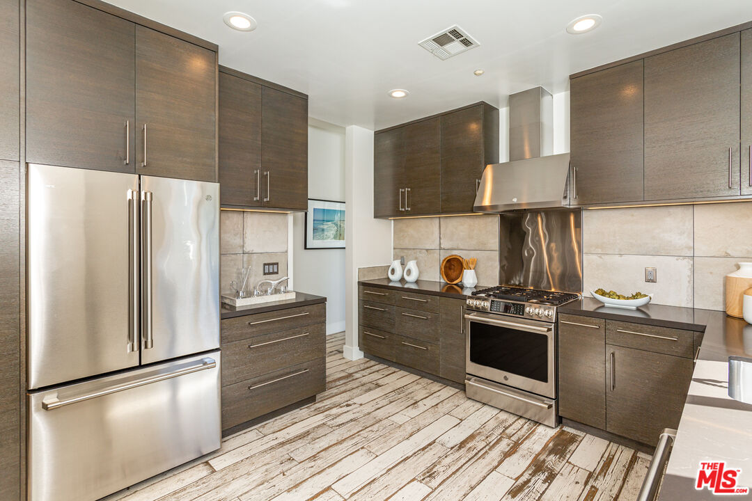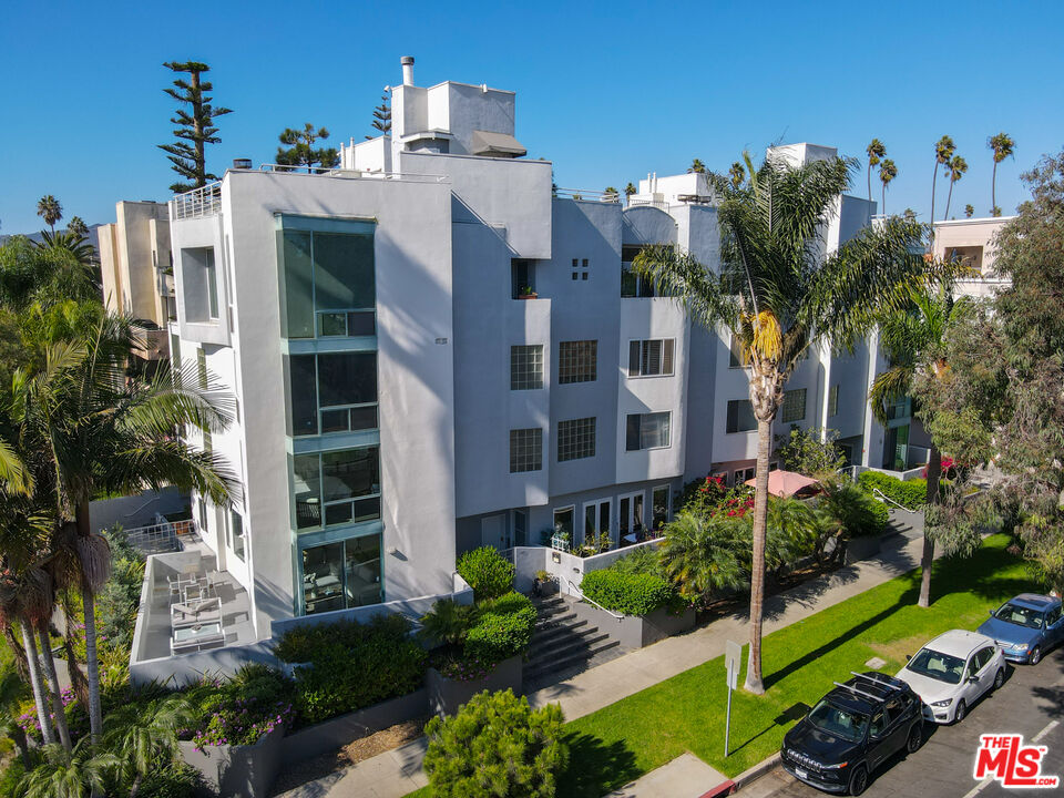 Exquisitely executed design and the finest materials create an elevated lifestyle - the 12-foot ceilings and walls of glass and the massive wrap-around private patio impart light, volume, and space. Walker-Zanger porcelain farmhouse tile floors, an artful kitchen with cerused oak cabinets, quartz counters and high-end stainless steel appliances. A large den perfect for home office, gym or guests plus a 3/4 bath round out the first level. Upstairs, three spacious bedrooms including an impressive corner primary suite with city views and a luxurious bath with glassed shower stall and separate soaking tub. Over 2,000 SF. 2-car side-by-side parking in security garage, elevator building, additional secured storage, guest parking and Earthquake insurance. Exclusive Santa Monica location North of Wilshire and just steps to Ocean Ave, Santa Monica beach, Third Street Promenade, Palisades Park, Montana Ave and more. Absolutely beautiful!