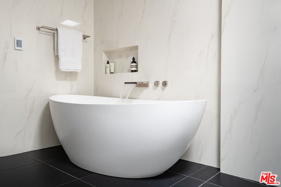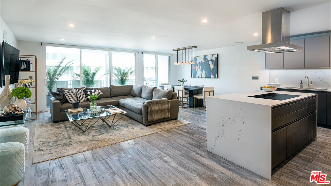 Rare top floor and single-level unit is located on Kings Road in the heart of West Hollywood. Completely renovated in a modern-minimalistic style to capture the essence of the mid century architecture. This open-plan unit features 2 bedroom, 2 bathrooms and offers an abundance of natural light throughout. Window walls encompass the unit and open to an approx. 300 sf outdoor terrace that runs the length of the unit - ideal for indoor-outdoor living. Chefs kitchen features double-oven Miele appliances, center island and custom soft-close Leicht cabinetry. Master bedroom features two separate closets and a spa-like bathroom with heated Italian stone flooring, custom black oak vanities, Dornbraucht plumbing fixtures and a Badeloft tub. Additional amenities include: in-unit laundry, motorized shades, skylights, built-in surround speakers, cat5 hardwiring throughout and pool.