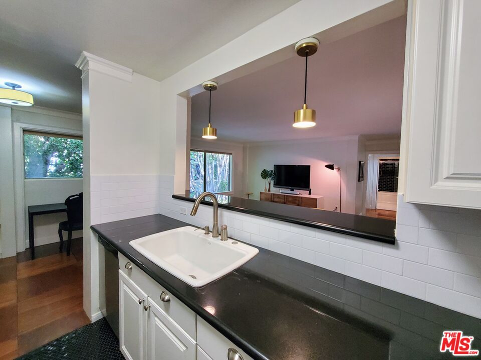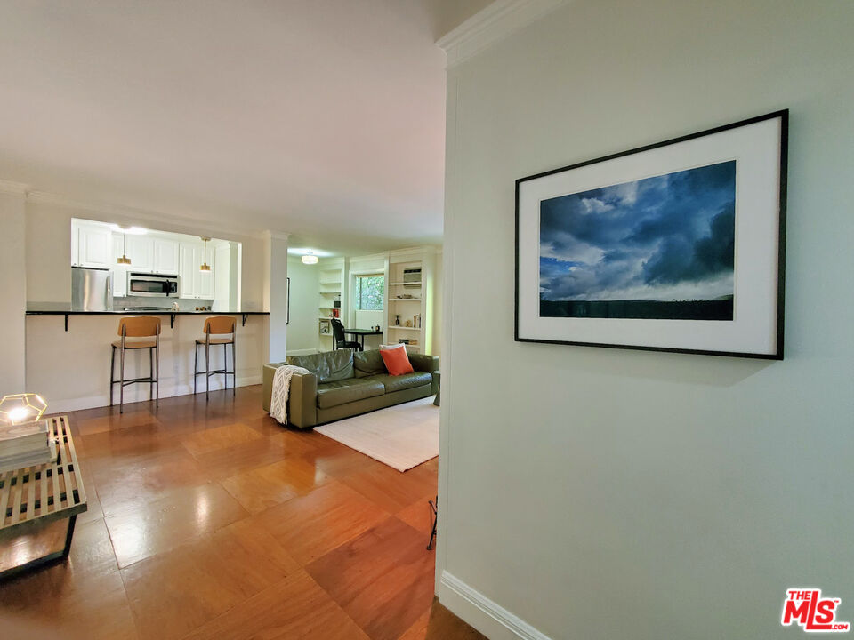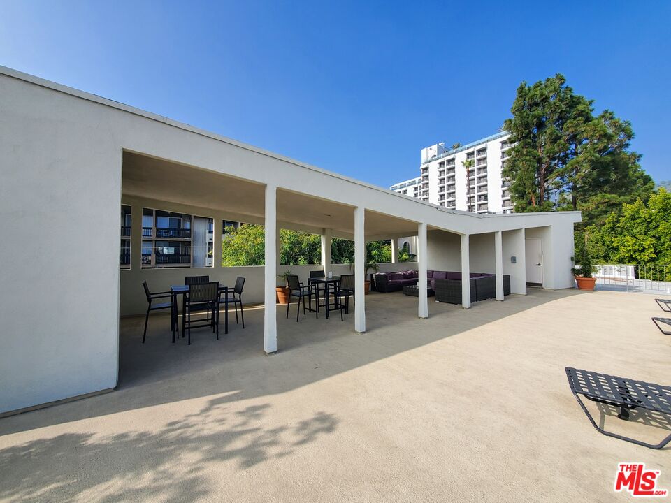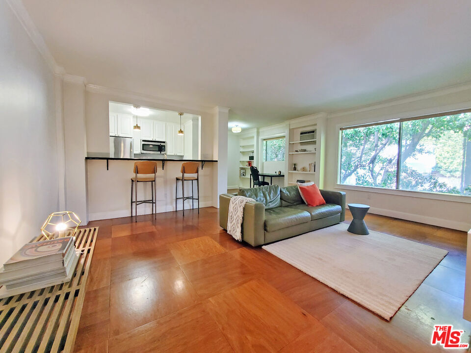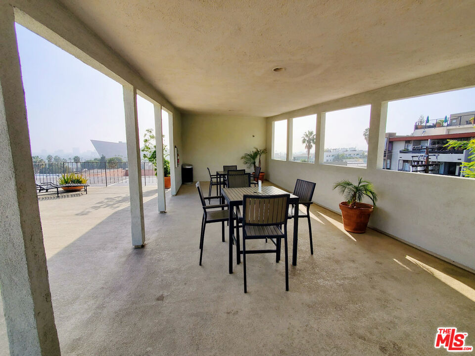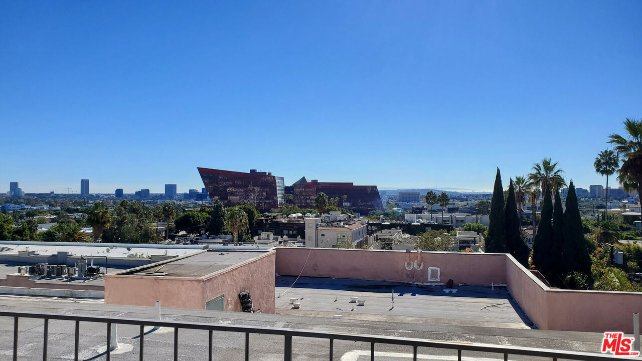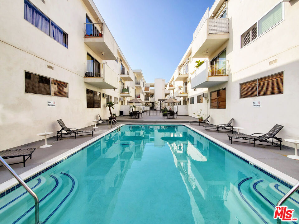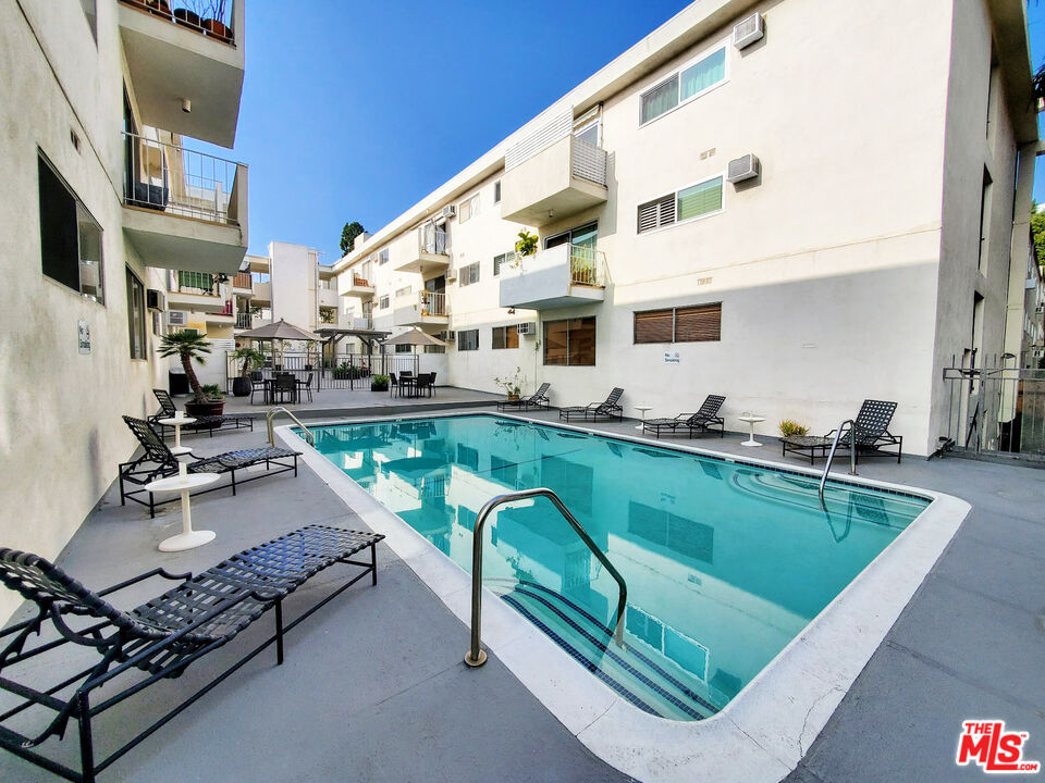 Welcome to the official location of the middle of EVERYTHING! Located between Sunset and Santa Monica Boulevards in desirable West Hollywood, you are seconds away from world class restaurants, cafes, bakeries, shopping, night clubs, chic hotels, and the world-famous Pacific Design Center. Also bordering Beverly Hills, this is the LA equivalent to Manhattan! With a "walk-score" of 92, this is one of the few locations in LA where you truly do not need a car. This lovely top floor unit (NOBODY ABOVE YOU) feels like you are living in an elevated tree-house with north facing tree-lined views. A large living room area allows for different seating arrangements and options for living space, built-in bookcases and a separate dining area. The galley kitchen has updated stainless appliances, electric stove, custom cabinetry, granite countertops, and a peek-through with counter seating. The primary bedroom is large and spacious with a gigantic walk-in closet with two entrances. The bathroom has lovely cabinetry, a shower/tub combo, mosaic tilework, and polished nickel fixtures. The building features extremely reasonable HOA dues, updated hallways and lobby, fitness area, large heated courtyard pool and lounge area, and a rooftop sundeck with sofas, tables and a stunning view of metropolitan Los Angeles. Comes with one underground security parking space, and storage closet. Community laundry but may be allowable 'in-unit' if approved by HOA.